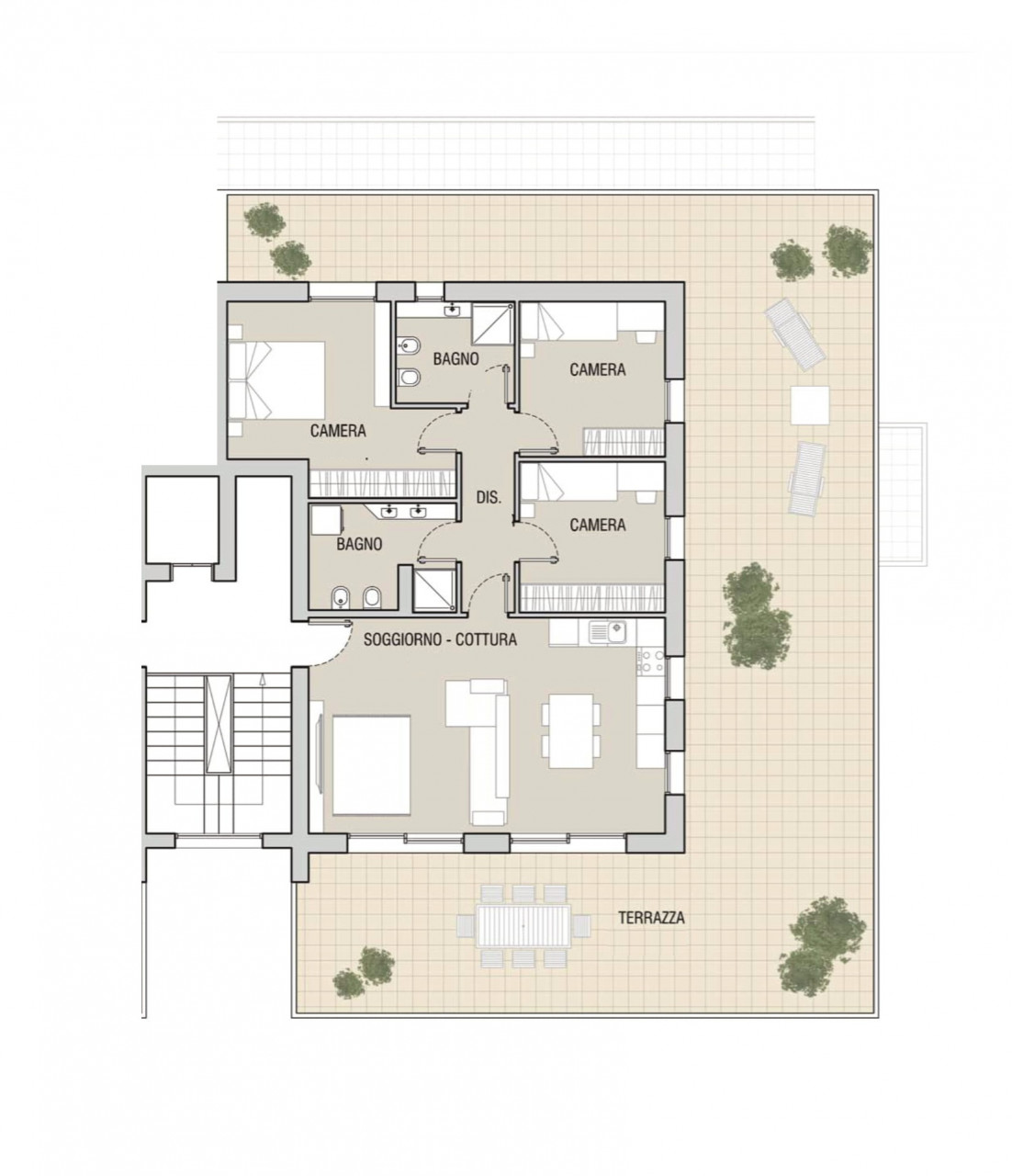 Con ben 110 mq di terrazzo privato su tre lati, questa proprietà è l'ideale per chi desidera vivere all'insegna della comodità e del relax. Ultimato nel 2023, l'appartamento offre spazi luminosi e moderni: un comodo soggiorno con cucina a vista perfettamente attrezzata, tre camere da letto e due bagni eleganti.
